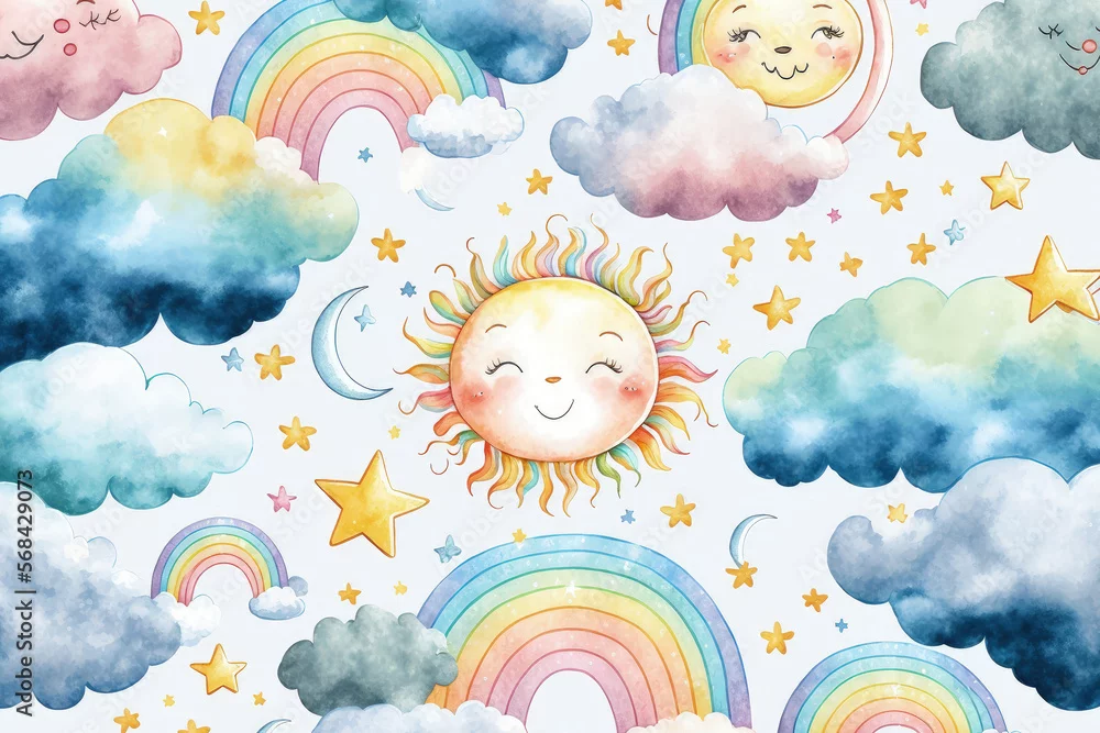 Fototapeta samoprzylepna Watercolor seamless pattern of a sweet baby boho rainbow with the sun, clouds, and moon phase. Decor for children's nurseries, nursery prints, and fabric. Generative AI