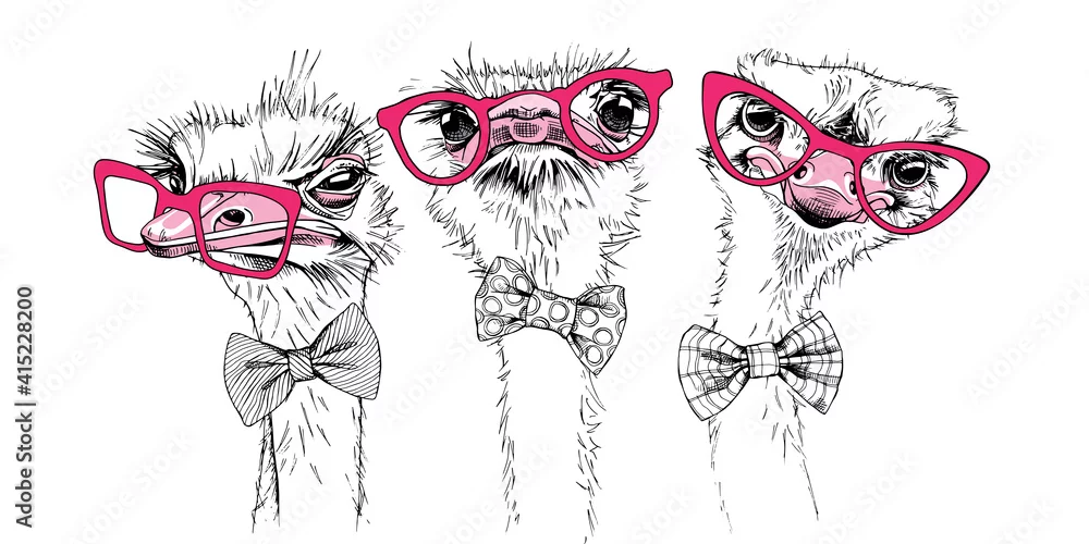 Portrait of a three Funny Ostriches Friends in a pink glasses and in a bow tie. Humor card, t-shirt composition, hand drawn style print. Vector illustration.