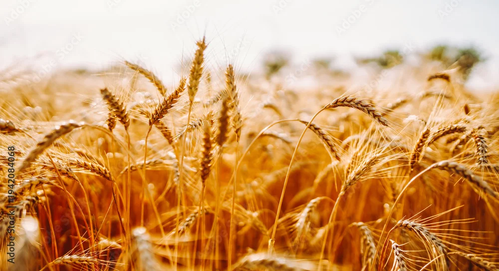 A field of wheat stands tall under a warm sunset. The golden stalks sway gently in the breeze as the day begins to end in the countryside, showing a clear harvest scene.