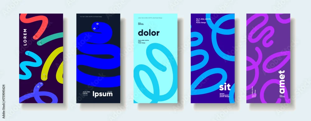 Fototapeta samoprzylepna A vibrant collection of five abstract posters featuring playful, colorful squiggles and bold typography. Each design showcases a unique combination of colors and shapes, creating a modern and dynamic