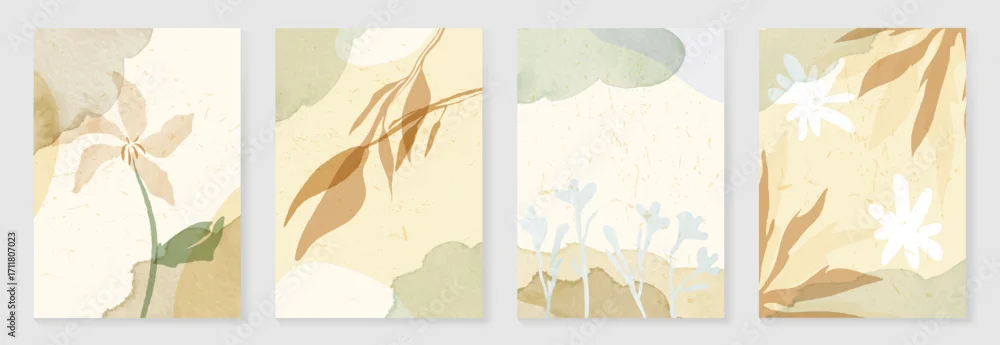 Fototapeta samoprzylepna Abstract botanical poster vector set. Leaves, flower in earth tone colors. Illustration design for Eco packaging, interior, cover, wall art, wallpaper. - do przedpokoju - Picturewall.pl