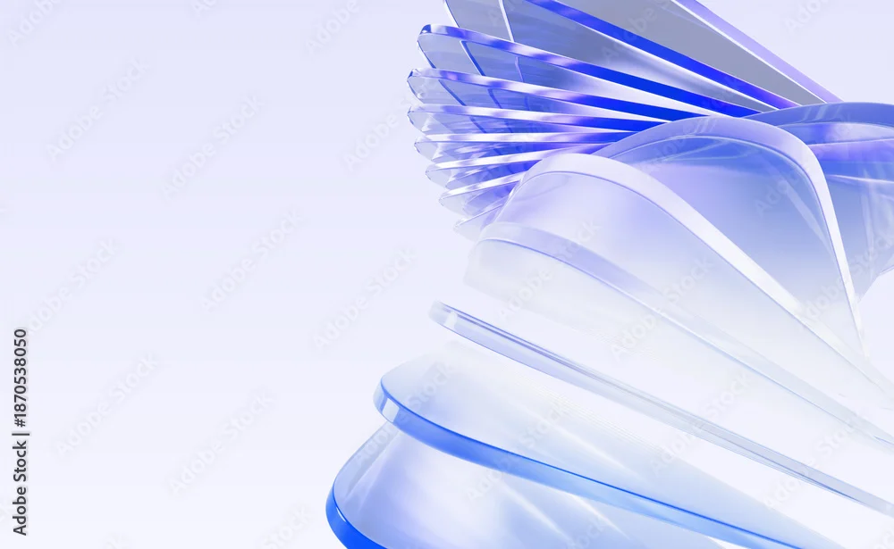 Abstract glass 3d background with layered effect, pastel light purple blue gradient. Render dynamic wave line pattern of crystal glossy shapes, graphic array. Futuristic tech banner. 3D illustration