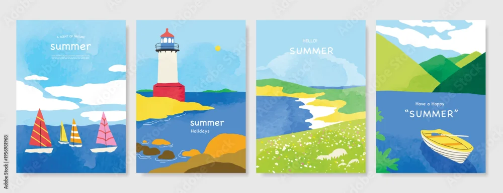 Abstract Green Summer landscape background vector set. Nature wallpaper of green field on mountain, yellow flowers, blue sky , birds, river. Watercolor illustration for cover, wall art, decoration.