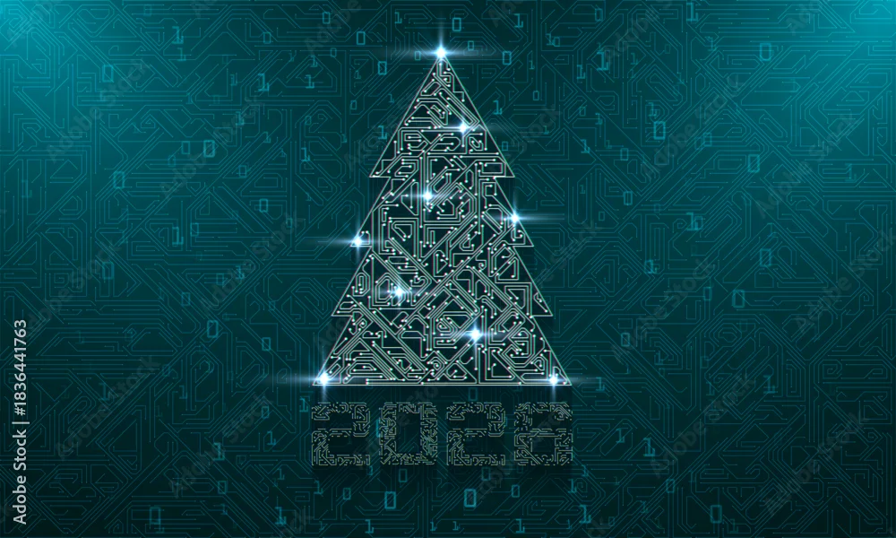 Fototapeta samoprzylepna Abstract neon christmas tree of circuit board, glowing technology concept. AI Artificial Intelligence chipset on circuit board in futuristic concept suitable for future technology artwork