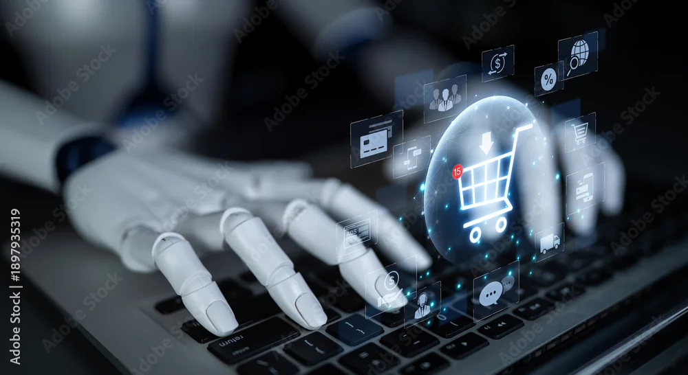 Fototapeta samoprzylepna An AI assistant manages a global e-commerce marketplace, personalizing the online shopping experience. The system optimizes the customer journey from product search to final payment. Fermion
