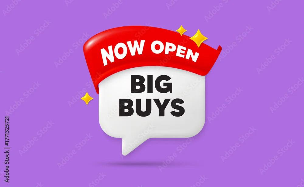 Fototapeta samoprzylepna Big buys chat speech bubble. Now open flag ribbon. Big buys tag. Special offer price sign. Advertising discounts symbol. 3d sparkle stars speech bubble. Vector