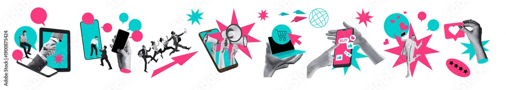 Bold collage social media marketing and digital communication. Concept of online engagement, influencer economy, content strategy, brand promotion, and modern business communication. Banner