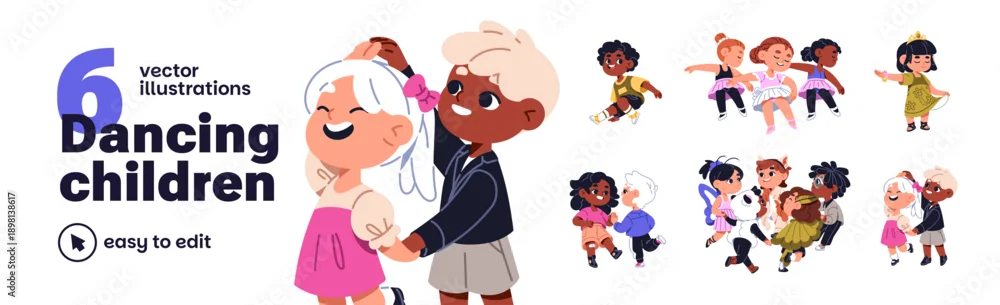 Children dance set. Child group of dancers performs ballet, breakdance together. Happy kids have fun with music. Cute little girls and boys at the disco. Flat isolated vector illustrations on white