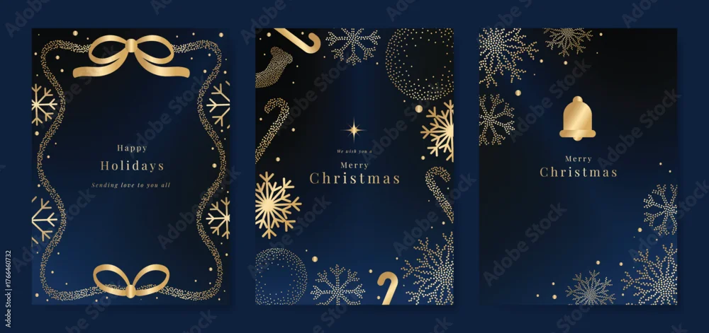 Fototapeta samoprzylepna Christmas and Happy Holidays card vector set. Luxury gold victorian frame, leaves branch, flower, star, snowflake on navy blue background. Design illustration for poster, cover, invitation, ads.