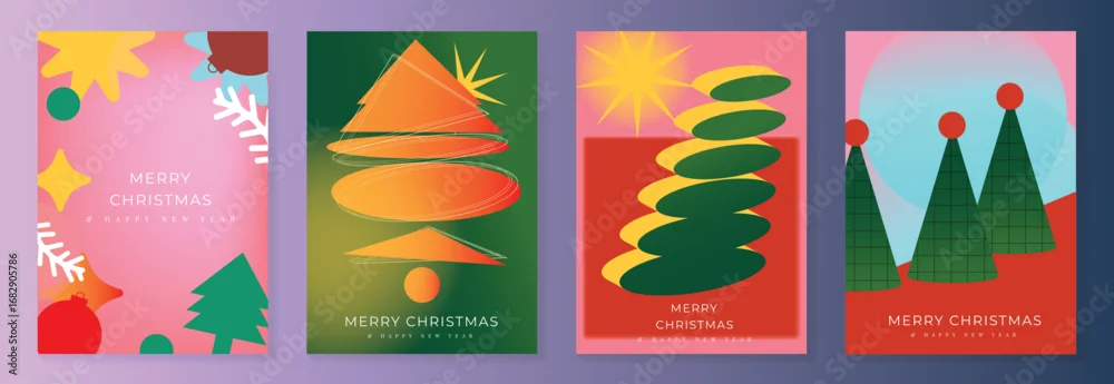 Fototapeta samoprzylepna Christmas and Happy Holidays poster vector set. Modern new year card template with christmas tree, bauble on pink red and green gradient background. Design for cover, website, promotion, ads.