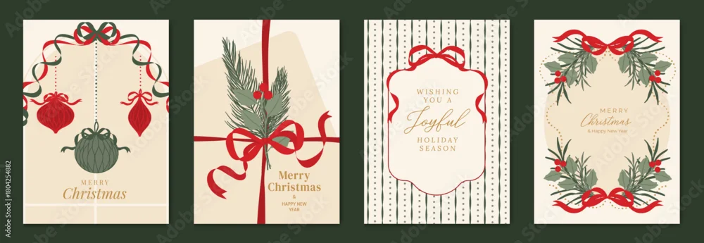 Christmas and Happy New Year greeting card vector set — cream and red classic Christmas frames with pine leaves and ribbons, festive theme for cards, posters and packaging.