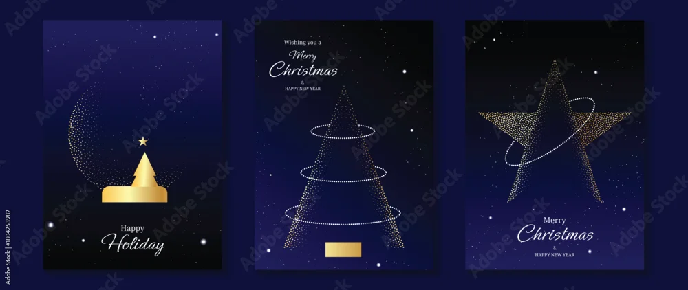 Christmas and Happy New Year greeting card vector set — navy blue and gold tree, candle and star elements, classic elegant theme for cards, posters and print use.