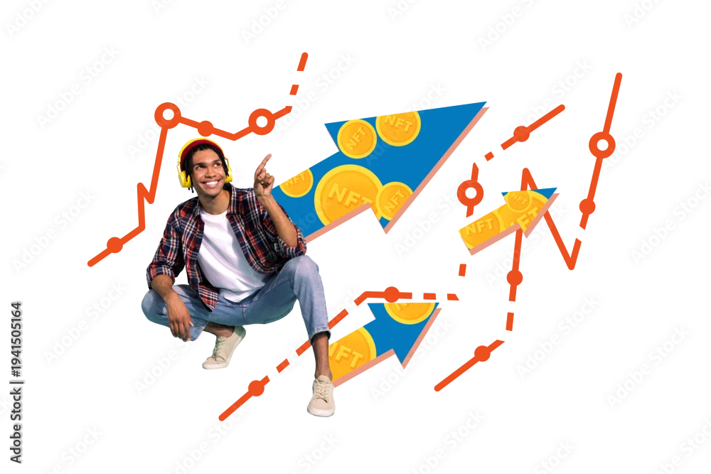 Collage picture young cheerful man finger showing nft virtual currency bitcoin golden tokens economy growth improvement development
