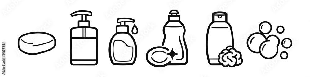 Fototapeta samoprzylepna Collection of hygiene and cleaning product icons including soap, dispensers, and bubbles