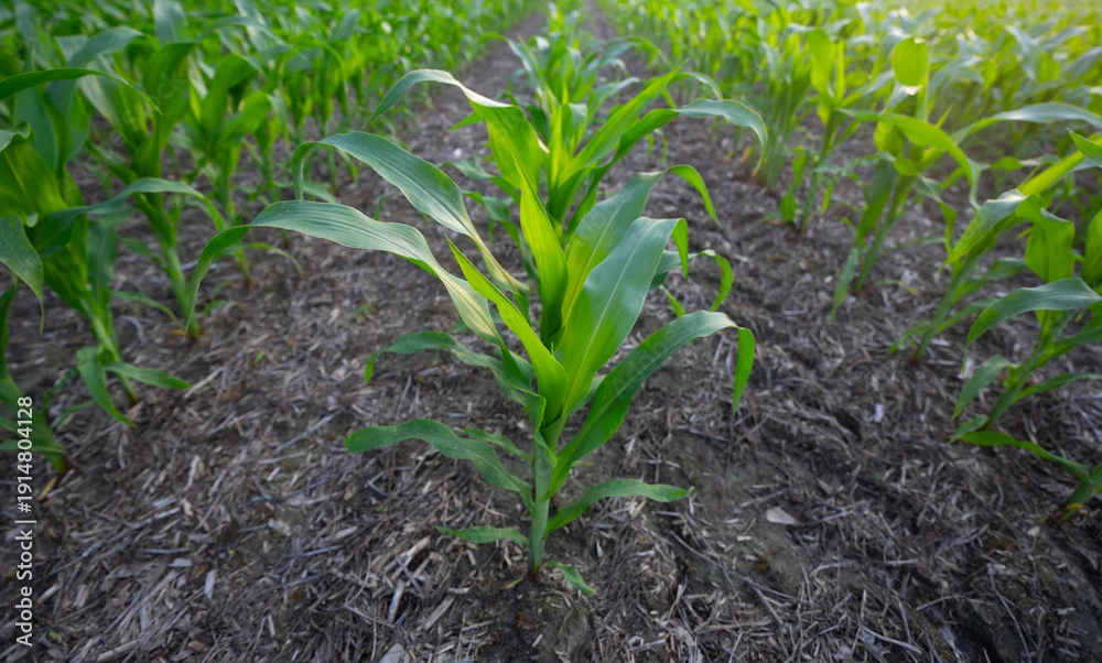 Fototapeta samoprzylepna Corn plants growing in neat rows on agricultural field. Growing maize plants. Corn crops. Rows of young corn on organic cornfield of soil. Cultivation of corn plants.