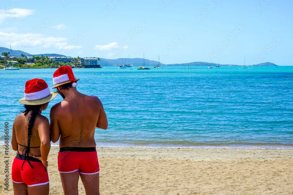 Fototapeta samoprzylepna Couple in Santa Hats Celebrating Christmas on a Tropical Beach. Concept of Holiday Travel, Seasonal Celebration, and Love in Paradise.