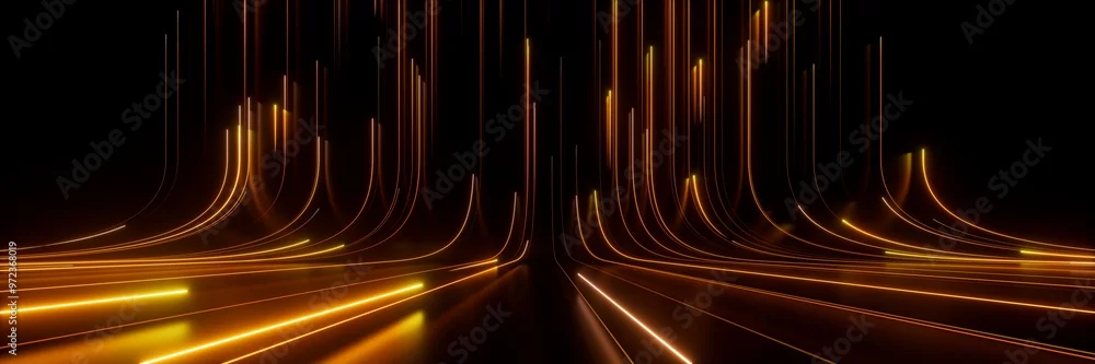 Fototapeta samoprzylepna 3d render. Abstract background of yellow neon lines ascending. Modern digital wallpaper. Streaming power