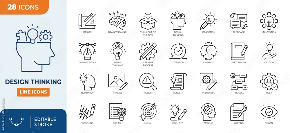 Design Thinking line editable icon set. Contain icons related to design, thinking, ideation, brainstorm, creativity, prototype, innovation, research, and more. Editable stroke. Vector illustration