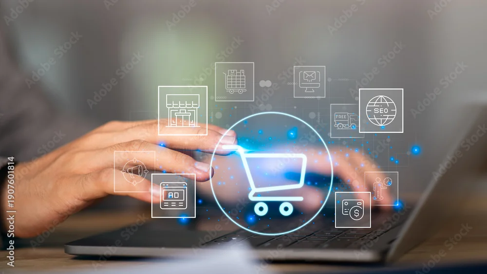 Fototapeta samoprzylepna Digital marketers optimize e-commerce performance using online shopping cart systems, SEO tools, digital advertising platforms, data-driven retail technology to increase conversions, sales efficiency