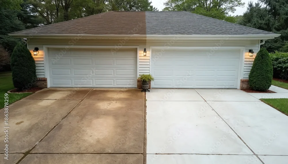 Fototapeta samoprzylepna Dirty garage driveway halved shows cleaning before and after. A stained concrete path is restored to a bright, fresh, white surface after pressure washing service.