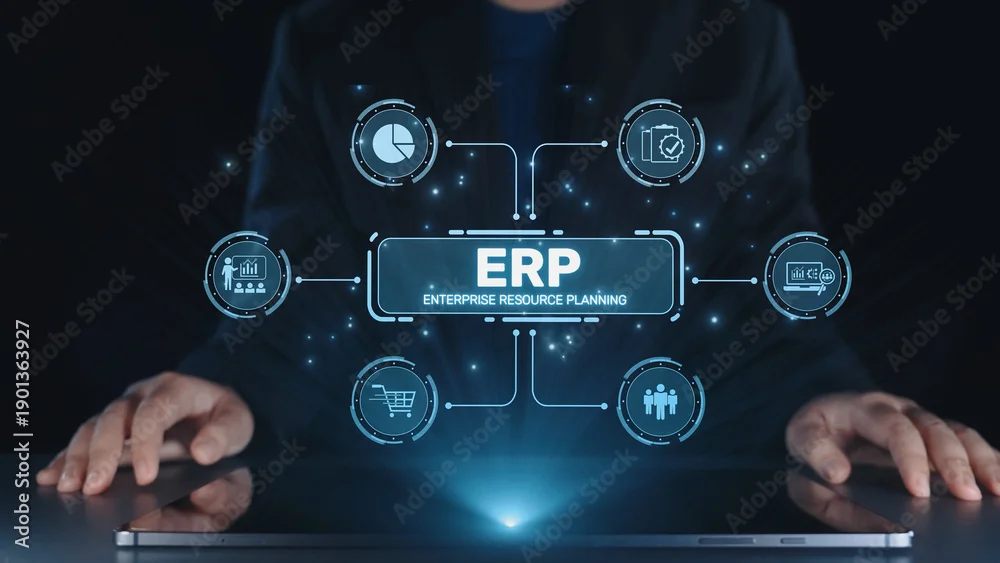 Fototapeta samoprzylepna ERP platform visual showing centralized system for enterprise resource planning, improving integration, data flow, business efficiency, finance, inventory, and human resources. Elide