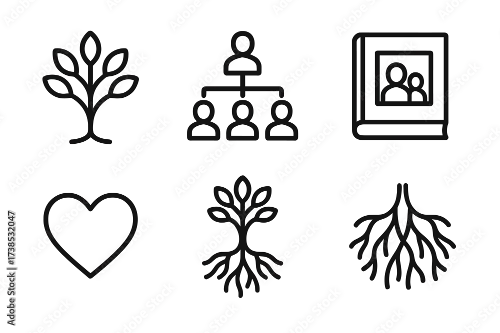 Family Tree Icons. Outline icon set of family tree: tree, branches, leaves, family members, photo frame, genealogy book, heart, roots. Line icons in only black