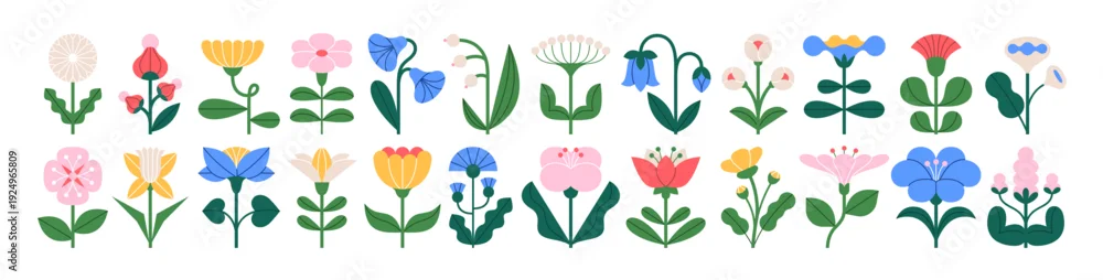 Fototapeta samoprzylepna Floral design elements, abstract folk style flowers set. Spring and summer blossoms with delicate petals, leaves. Nature decor of geometric shape. Flat vector illustration isolated on white background
