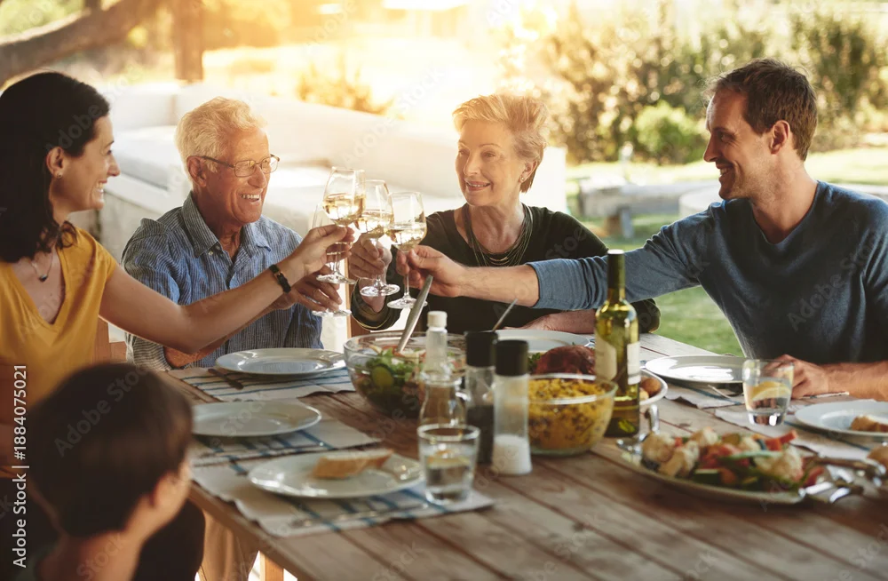 Fototapeta samoprzylepna Food, love and large family with toast on patio for event, party or birthday celebration. Wine, cheers and group of people in backyard for brunch, bonding and support with reunion lunch for parents