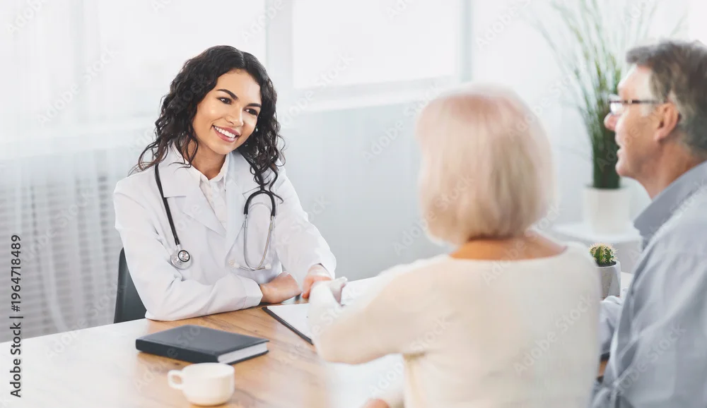 Fototapeta samoprzylepna General Practitioner. Mexican woman physician and senior couple patients handshaking at doctor's office, copy space