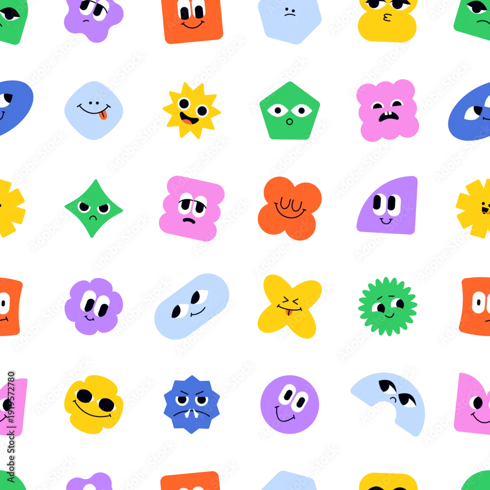 Fototapeta samoprzylepna Geometric shape characters pattern. Seamless print of abstract cute blob faces smiling emojis, modern wallpaper organic geometry messy figures with facial emotions. Vector background