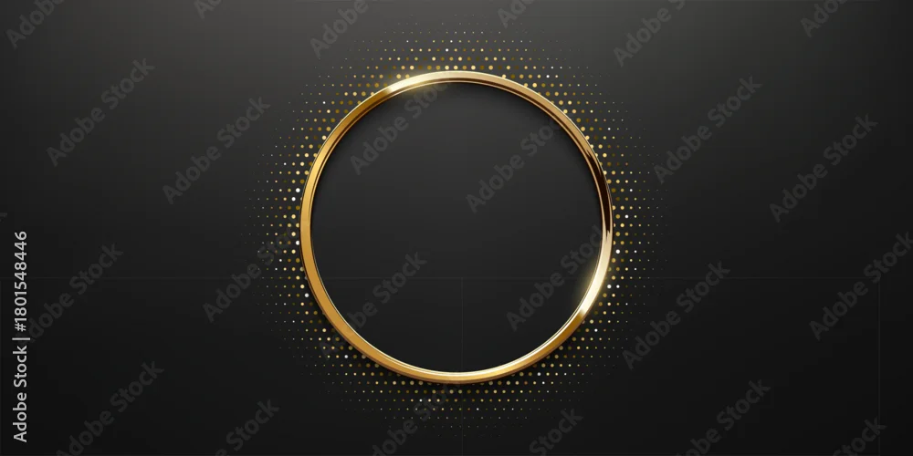 Fototapeta samoprzylepna Golden circle frame with dotted halftone light effect. Circular glowing metallic ring, button, stamp, emblem, sticker, label. Modern luxury abstract vector illustration.