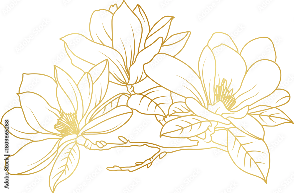 Golden magnolia flowers line art isolated on white background. Luxury magnolia floral design elements for invitation, wedding, wallpaper, print template, vector illustration