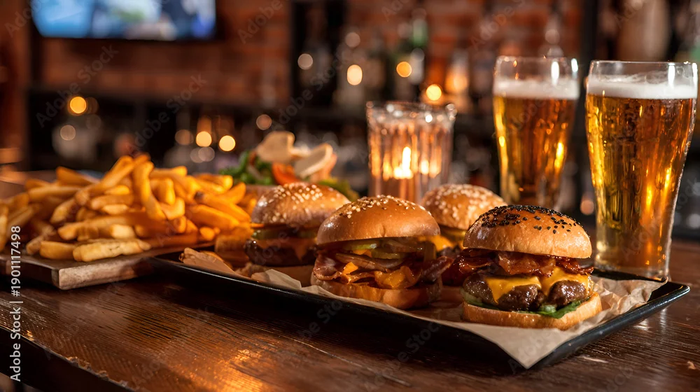 Fototapeta samoprzylepna Gourmet mini burgers with fries and craft beer