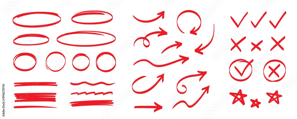 Hand drawn pen line highlight red set. Line red hand drawn pen marker stroke underline, arrow, check mark emphasis. Round oval, circle scribble frame, arrow elements . Vector illustration