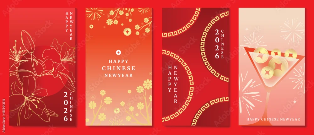 Happy Chinese New Year 2026 vector poster set with floral line art, fireworks, geometric border and gold coins. Red holiday design for cards, invitations, banners and packaging.