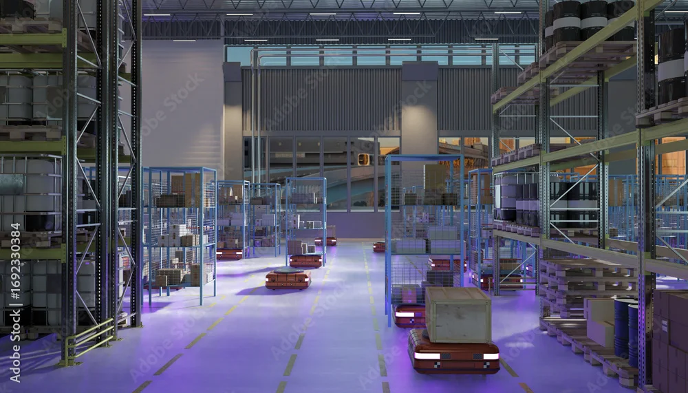 Fototapeta samoprzylepna Logistics, Automation, Robotics, Warehouse. High-tech automated warehouse with robotic vehicles transporting crates and smart storage racks, representing modern logistics, supply chain automation - do przedpokoju - Picturewall.pl