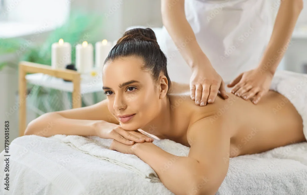 Fototapeta samoprzylepna Massage spa relaxation with therapist and woman. Masseuse massaging back of female lying on couch. Wellness therapy targets back treatment and body care in clinic, promoting rest and balance.