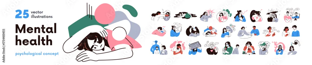 Fototapeta samoprzylepna Mental health and psychological concepts set. People with anxiety, depression, stress, fear emotions. Psychology and mind problems, disorders. Flat vector illustrations isolated on white background