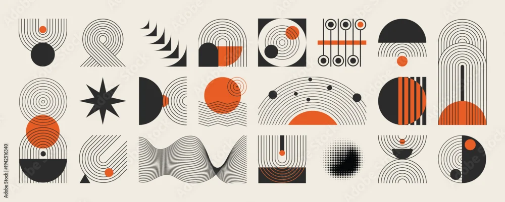 Mid century abstract vector element set. Retro aesthetic contemporary stripe line art, geometric shape in monochrome. Art form design for wall art, decoration and wallpaper.