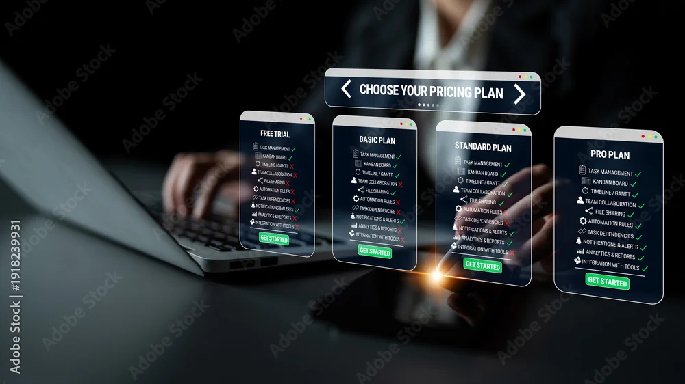 Fototapeta samoprzylepna Modern Digital Pricing Plan Selection on Mobile Devices with User Interface Elements and Laptop Background Quark.