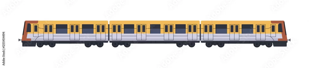 Modern passenger train side view. Underground railroad transport with carriages. Electric locomotive of subway with wagons. Railway coaches, rail transit. Flat isolated vector illustration on white