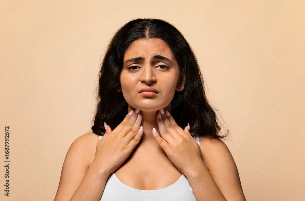 Portrait of unhappy sad sick indian woman suffering from sore throat, ill young eastern lady touching neck with hands, feeling ache, standing isolated over beige studio background, copy space