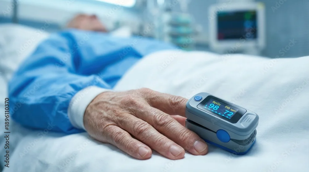 Senior patient's hand with pulse oximeter monitoring vital signs in an intensive care hospital room with copy space for medical and healthcare concept.