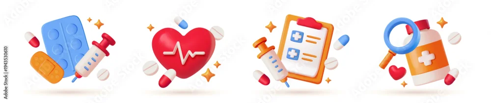 Fototapeta samoprzylepna Set of 3D medical concepts. Stickers with pills and drugs, pharmaceuticals, heart and doctor prescription for treating diseases. Plasticine style vector illustration collection isolated on background