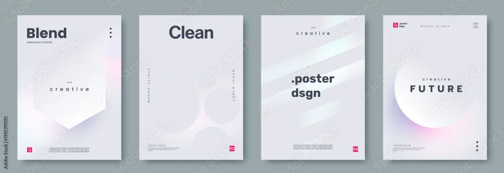 Fototapeta samoprzylepna Set of modern minimalist poster designs with soft holographic gradients, abstract geometric shapes, and clean typography. Ideal for branding, banner, advertising, presentations, covers
