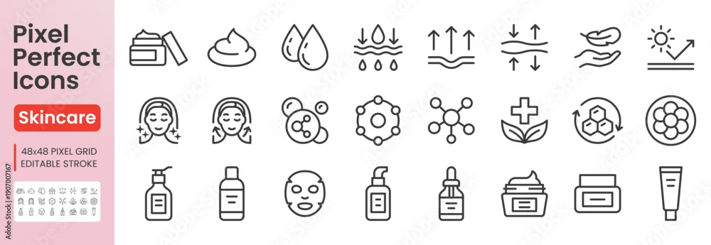 Fototapeta samoprzylepna Skin care line icon set. Retinol, beauty collagen, niacinamide, nourishing cream, face anti wrinkle minimal vector illustrations. Simple outline skincare signs. 48x48 Pixel Perfect. Editable Stroke