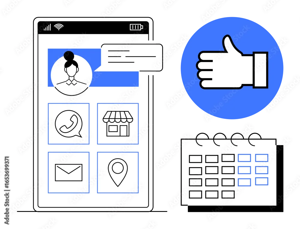 Smartphone screen showcasing user profile, messaging, contact options, calendar, location pin, storefront, and thumbs up icon. Ideal for communication, scheduling business networking social media