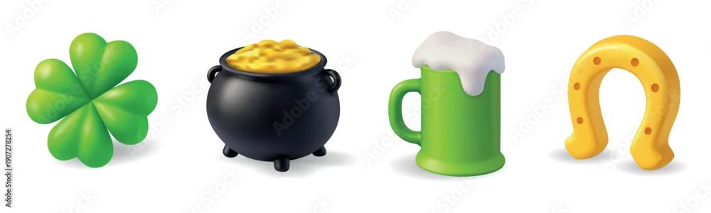 Fototapeta samoprzylepna St. Patricks Day set. Clover, pot of gold, green beer mug, and golden horseshoe. 3D festive vector illustration