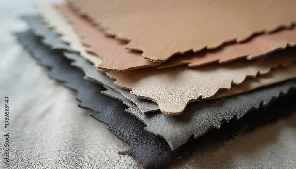 Stack of smooth leather swatches in neutral tones. Natural material samples arranged for texture and color comparison. Craftsmanship detail for fashion and design.