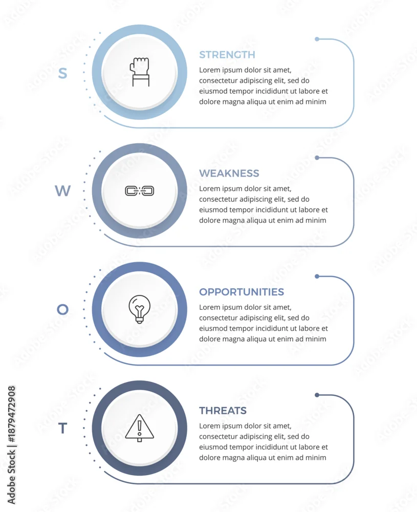 Fototapeta samoprzylepna SWOT diagram infographic template with four vertical stages showing strength, weakness, opportunity, and threats